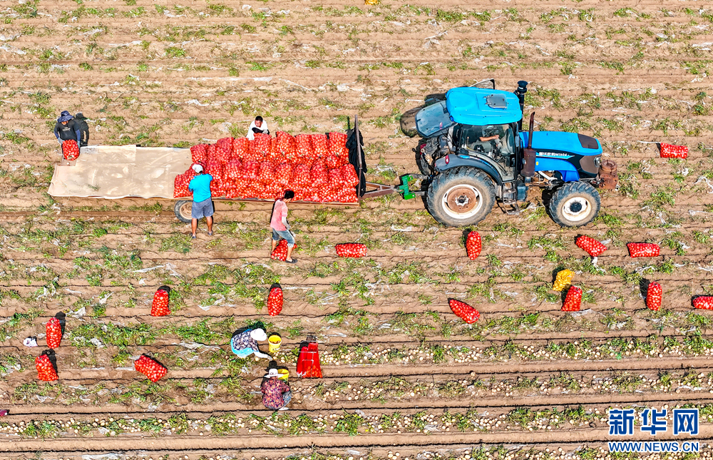 种植户紧抓有利天气在田间采收马铃薯(无人机照片)。新华网发(张进刚 摄)