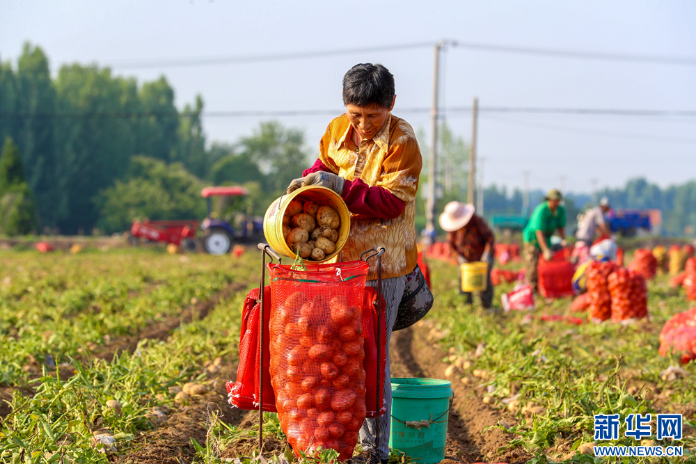 6月25日,在青岛西海岸新区六汪镇,种植户在田间收获马铃薯。新华网发(张进刚 摄)