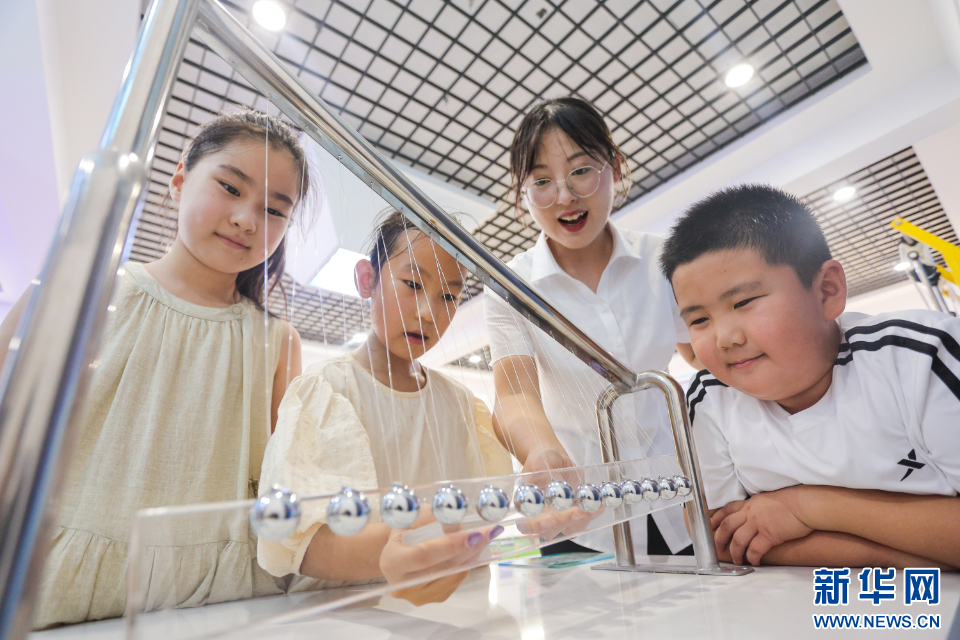 在利国社区科普体验中心,孩子们在体验蛇形摆项目。新华网发(卞俊涵 摄)