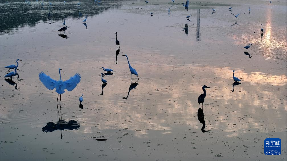 8月7日,白鹭在山东省高密市境内的胶河湿地觅食(无人机照片)。