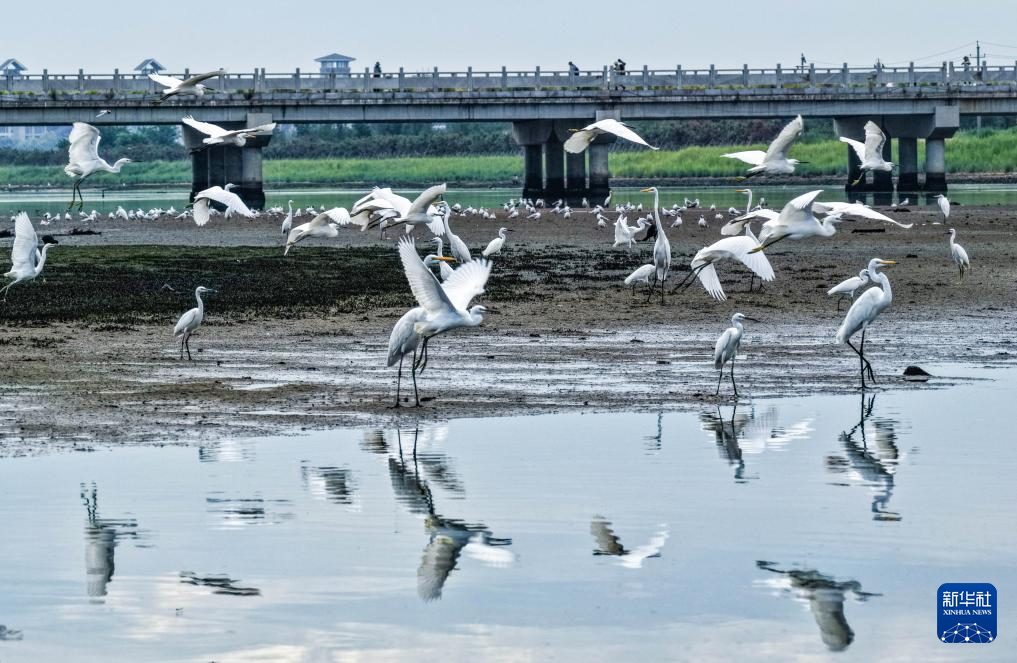 8月11日,在山东省荣成市桑沟湾湿地公园一处水域,成群的黄嘴白鹭、苍鹭等在休憩觅食。